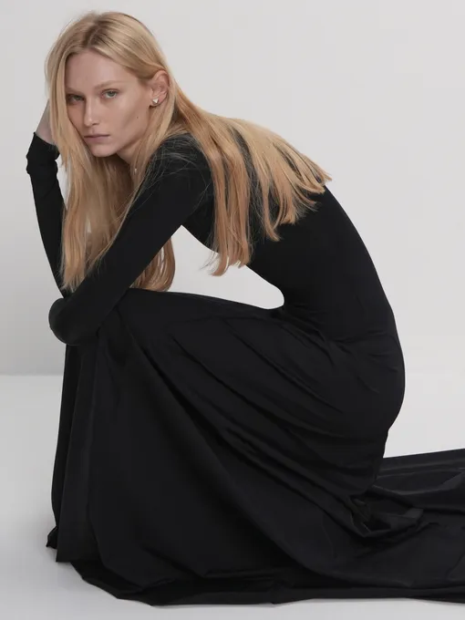 Для коллекции отобраны разные по фактуре ткани: от нежного тенсела до плотного футера, который держит форму. Единственным связующим звеном с ювелирной линией дизайнера стала серебряная вязаная юбка с вариативной посадкой.