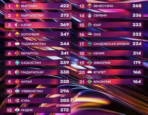 После этого стала известна страна-хозяйка этого праздника в следующем году. «Королевство Саудовская Аравия официально сообщило о готовности принять у себя международный музыкальный конкурс "Интервидение" в 2026 году», — объявил Воробьев. «Мы с огромным удовольствием передаем эстафету нашим саудовским друзьям», — добавила Гарифуллина.