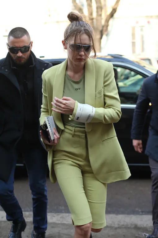 Для выхода Джиджи выбрала светло-фисташковый костюм — пиджак и короткие бриджи, которые дополнила топом на пару оттенков темнее. На ноги она надела ботинки Dr. Martens со светло-серыми носками. Дополнила образ небрежная прическа — волосы, собранные в растрепанный пучок.