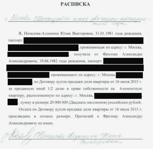 Сегодня был обнародован и еще один документ – расписка певицы в получении паспорта от ее гражданского мужа, хоккеиста Александра Фролова. Документ, сделанный в 2015 году для договора купли-продажи квартиры, был подписан Юлией Началовой-Алдониной.