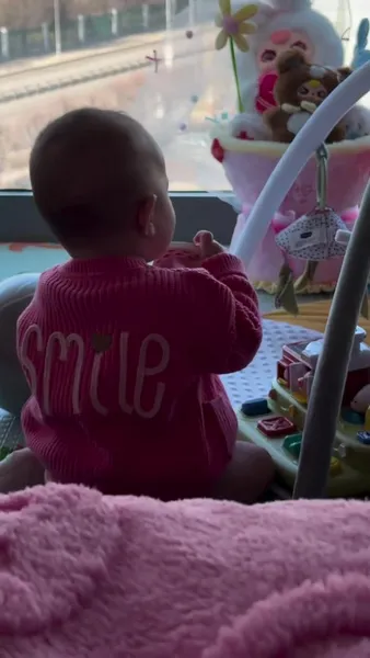 Эмма предстала в очаровательном розовом свитере, надетом поверх удобного боди. Девочка уже сидит сама: она внимательно рассматривала вид за окном.