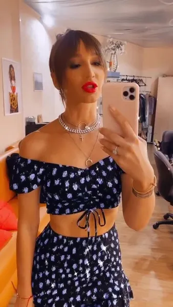 Бузова предстала в эффектном комплекте с цветочным узором – кроп-топе со шнуровкой и открытыми плечами, а также в мини-юбке с оборками. Завершающими штрихами образа стали красная помада, массивная цепочка и накладная челка.
