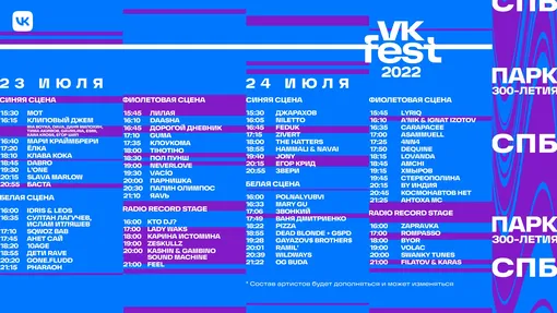VK Fest пройдёт при поддержке организационного партнёра Радио Record с 23 по 24 июля в Москве, Санкт-Петербурге и Сириусе (Сочи) — вход в Сириусе свободный, но можно приобрести билеты в ложу и расположиться на многоуровневом подиуме с отличным видом на сцену и отдельным баром.