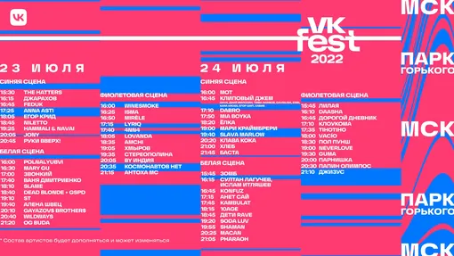 В московском Парке Горького и петербургском Парке 300-летия на тематических сценах выступят более 80 популярных артистов. За два фестивальных дня на Синей сцене VK Fest новинки и хиты исполнят Баста, ANNA ASTI, Джарахов, Jony, Егор Крид, Ёлка, «Звери», Zivert, Клава Кока, L’One, MIA BOYKA, Мари Краймбрери, Мот, NILETTO, «Руки Вверх», SLAVA MARLOW, FEDUK, HammAli & Navai, The Hatters и Dabro.