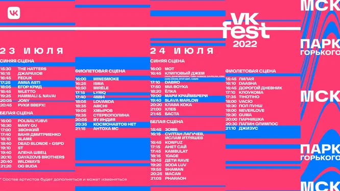 В московском Парке Горького и петербургском Парке 300-летия на тематических сценах выступят более 80 популярных артистов. За два фестивальных дня на Синей сцене VK Fest новинки и хиты исполнят Баста, ANNA ASTI, Джарахов, Jony, Егор Крид, Ёлка, «Звери», Zivert, Клава Кока, L’One, MIA BOYKA, Мари Краймбрери, Мот, NILETTO, «Руки Вверх», SLAVA MARLOW, FEDUK, HammAli & Navai, The Hatters и Dabro.