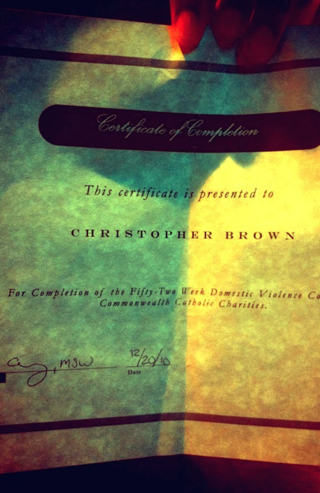 21-летний певец Крис Браун получил предписание суда, согласно которому он должен был пройти реабилитационный курс для склонных к домашнему насилию мужчин. Это предписание суд выдал ему, после того как в феврале 2009 года он напал на свою теперь уже бывшую девушку Рианну. 20 декабря его курс реабилитации был полностью пройден. Свой сертификат об окончании курсов Крис Браун опубликовал в Интернете.