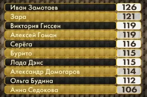 В итоге Седокова получила самую низкую оценку из всех участников выпуска — 17 баллов. В сумме за девять выпусков у нее 106 баллов, с которыми она занимает последнее место. А лидирует с большим отрывом Иван Замотаев – у него 126 баллов.