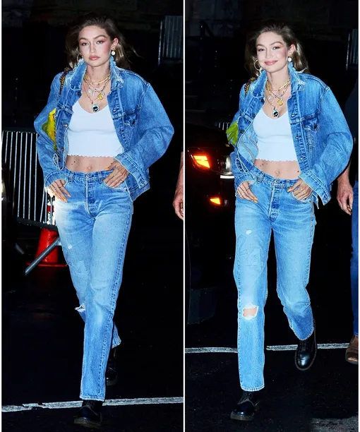 Так, сама Джиджи появилась в джинсах и джинсовой куртке. Тотальный деним «разбавили» украшения и белый кроп-топ.