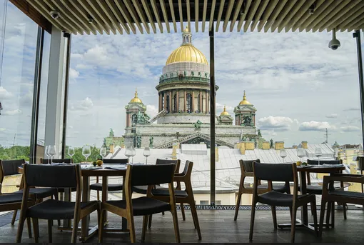 В городе, где панорамы ценятся не меньше, чем еда, «Мансарда» остаётся одной из немногих точек, откуда Петербург виден сразу в нескольких перспективах: стеклянный бизнес-центр, крыши XIX века, купол Исаакия в полный рост. Внутри — светлое пространство с тёплым деревом, мягкими линиями и вниманием к деталям: винтажные стаканы, старинные ложки, лаконичная мебель. Интерьер проектировала миланская студия Piuarch — та самая, что работает с Dolce & Gabbana и проектировала Ginza Tower в Токио, — но в «Мансарде» она ушла от нарочитой роскоши в сторону спокойной, европейской сдержанности. В меню — европейская и азиатская классика, в винной карте — широкая палитра наименований со всего света.