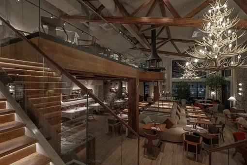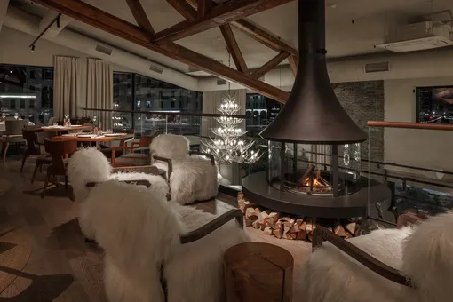 Интерьер «Альпинистов» продолжает эстетику гор — впечатляет и одновременно умиротворяет: камин, деревянные столы и стулья, 9-метровые потолки, панорамные окна, антикварные детали, мягкие шкуры и пушистые подушки на диванах.