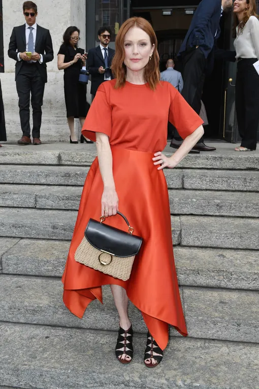 В первом ряду за происходящем на подиуме наблюдала Джулианна Мур (Julianne Moore). Актриса появилась на шоу вместе с мужем, продюсером Бартом Фрейндлихом. Джуллиана выбрала элегантное платье в пол необычного оттенка, который идеально вписался в концепцию новой коллекции бренда.