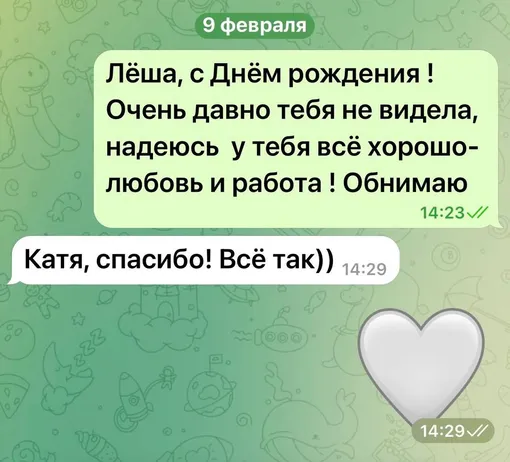 Стриженова опубликовала и последнее сообщение от Пиманова. 9 февраля телеведущий ответил коллеге на поздравление. «Лёша, с днем рождения! Очень давно тебя не видела, надеюсь, у тебя всё хорошо — любовь и работа! Обнимаю», — написала она. «Катя, спасибо! Всё так», — заверил Алексей Викторович.