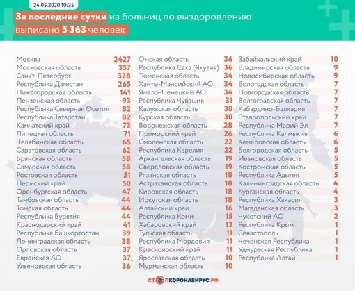 Москва остается наиболее опасным регионом России. Однако количество новых пациентов уменьшилось. Сегодня Оперштаб при правительстве сообщил о 2516 заболевших. Далее следуют: Московская область – 862 человека, Санкт-Петербург – 384, Нижегородская область – 221, Ростовская область – 152, Красноярский край – 146, Калужская область – 123, Самарская область – 121, Иркутская область – 120, Дагестан – 113, Брянская область – 111, Ярославская область – 107, Ханты-Мансийский АО — 102 пациента. Полные данные по регионам смотрите в таблице.