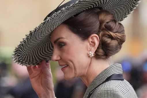Герцогиня сделала естественный макияж и элегантную прическу, собрав крупные локоны сзади. Она надела серую шляпку от любимого английского бренда Juliette Botterill и изящные жемчужные серьги от Cassandra Goad в форме цветка. Это украшение занимает особое место в ювелирной коллекции Кейт Миддлтон.