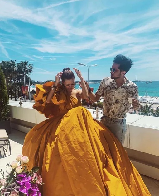 В предпоследний день кинофорума россиянка примерила эффектное ассиметричное платье горчичного цвета с пышной юбкой. Снимок в этом образе она опубликовала в Instagram (Социальная сеть признана экстремистской и запрещена на территории Российской Федерации). На фото видно, как стилист поправляет прическу звезде.