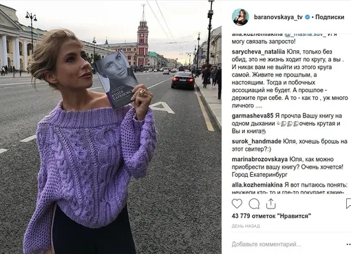 Недавно 33-летняя телеведущая разместила в Instagram (Социальная сеть признана экстремистской и запрещена на территории Российской Федерации) фотографию из Санкт-Петербурга, куда приехала для презентации своей книги «Все к лучшему — проверено мной». «Ирония судьбы или закономерность презентовать свою книгу на том же углу Невского и Садовой спустя пятнадцать лет после первой встречи», — написала Барановская (Орфография и пунктуация здесь и далее авторские. — Прим. ред.).