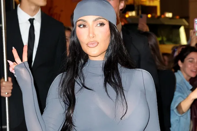 Представительница голливудского клана Кардашьян-Дженнер открыла новый магазин в центре мегаполиса, в котором представила коллекцию своего бренда Skims, созданную совместно с Nike. Ким Кардашьян выбрала для мероприятия серый комбинезон из прозрачной ткани, сквозь которую были видны бюстгальтер и трусики с высокой посадкой. Облегающий силуэт наряда подчеркнул фигуру звезды с фирменными изгибами. По бокам были видны белые полосы, знаменующие коллаборацию со спортивным гигантом. Образ дополнили бандана и остроносые туфли на шпильке в такой же цветовой гамме.