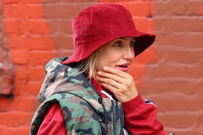 Диаз, вернувшаяся к актерской деятельности после перерыва, была замечена в районе Гринпойнт, Бруклин, в необычном наряде: камуфляжный жилет, спортивная куртка, джинсовые бермуды, розовые полосатые колготки и светлые кроссовки. Завершала образ красная панама, накинутая на развевающиеся светлые волосы.