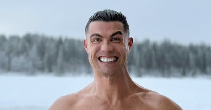 Криштиану предстал в одних плавках на утопающей в снегу веранде деревянного шале, возле которой была вырыты специальная прорубь в озере для погружения. Роналду пребывал в прекрасном настроении, предвкушая небывалый контраст температур.