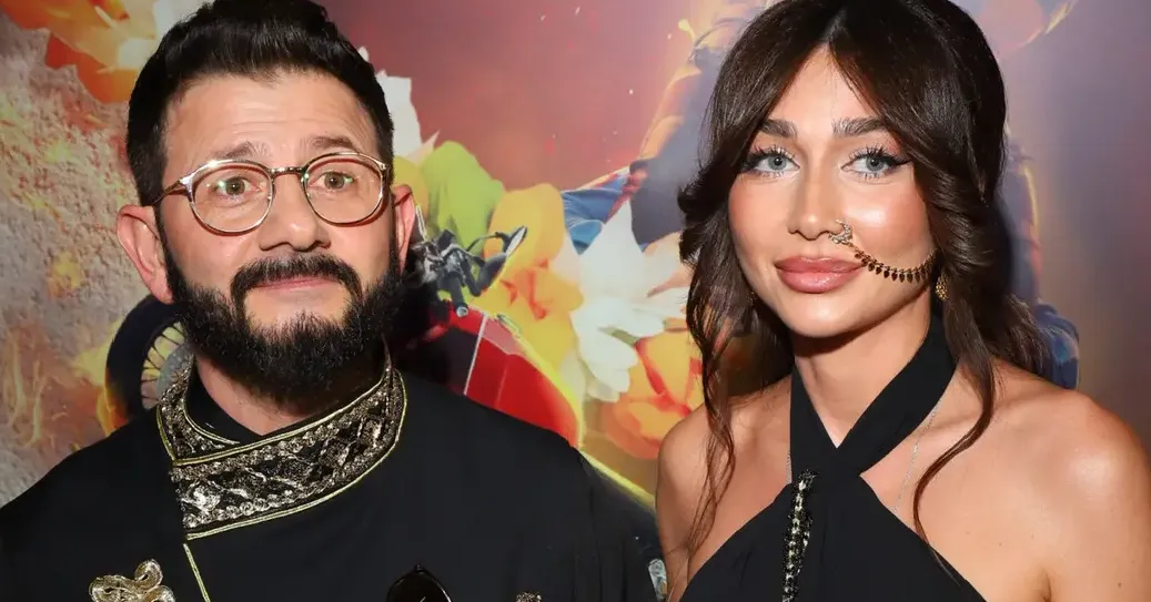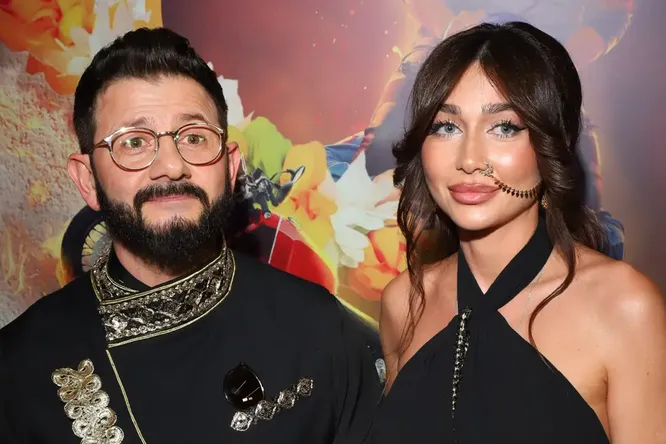Влюбленные облачились в парные наряды. На Галустяне был черный костюм с золотыми вставками в индийском стиле. Его спутница надела черно-золотое платье в пол в духе Болливуда. Приталенный фасон наряда подчеркнул ее стройную фигуру.