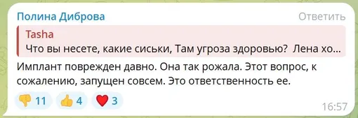 Диброва обвинила соперницу в том, что она ранее не хотела решить проблему. «Имплант поврежден давно. Она так рожала. Этот вопрос, к сожалению, запущен совсем. Это ответственность ее», — написала модель в своем Telegram-канале, отвечая на вопросы пользователей.