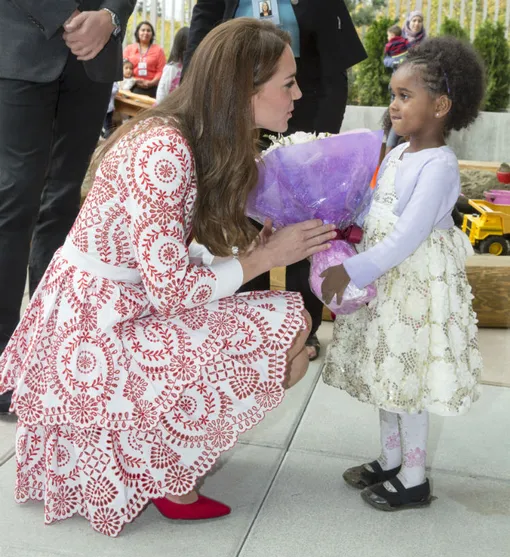 Кейт снова поразила стильным образом: для второго дня герцогиня выбрала платье в цвет флага Канады от любимого ею бренда Alexander McQueen и дополнила его алыми лодочками Hobbs и клатчем Miu Miu.