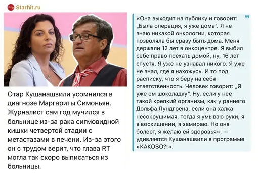 Кушанашвили публично усомнился в том, что Симоньян проходит лечение от рака. «Я не знаю никакой онкологии, которая позволяла бы сразу быть дома. Меня держали 12 лет в онкоцентре. Я выбил себе право поехать домой, ну, 16 лет спустя. Я уже не узнавал никого. Я уже не знал, где я нахожусь. И то под расписку, что я беру на себя ответственность», — процитировало Отара издание «СтарХит».