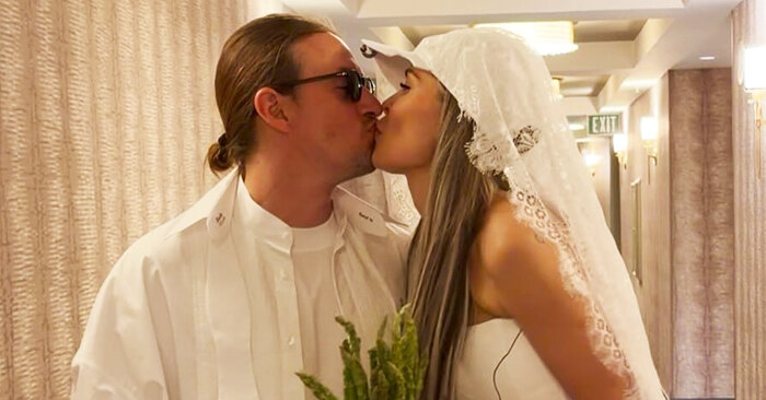 Мария выбрала для церемонии облегающее белое мини-платье с открытыми плечами, которое дополнила куртка оверсайз из латекса. Вместо классических лодочек невеста предпочла оригинальные белые кроссовки на контрастной черной шпильке. Артистка надела ажурную фату, правда, вместо шляпки компанию ей составила бейсболка.