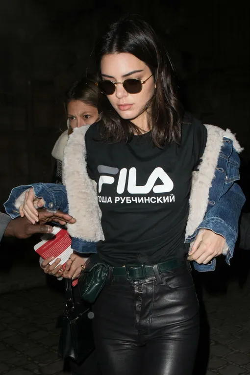Также представительница клана Кардашьян гуляла по Парижу в толстовке дизайнера Гоши Рубчинского (Gosha Rubchinskiy). Кендалл дополнила образ кожаными расклешенными брюками и джинсовой курткой.