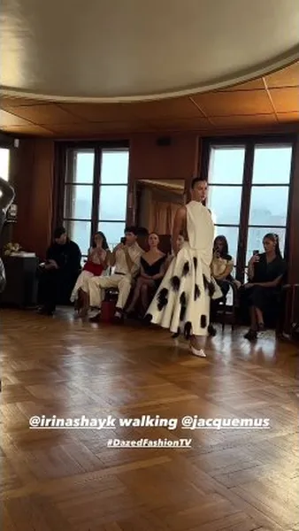 Ирина Шейк приняла участие в показе бренда Jacquemus, который состоялся в рамках Недели моды в Париже. Топ-модель предстала перед публикой в белом топе с открытой спиной и вырезами по бокам без нижнего белья. Звезда подиума надела юбку-миди с пушистой аппликацией.
