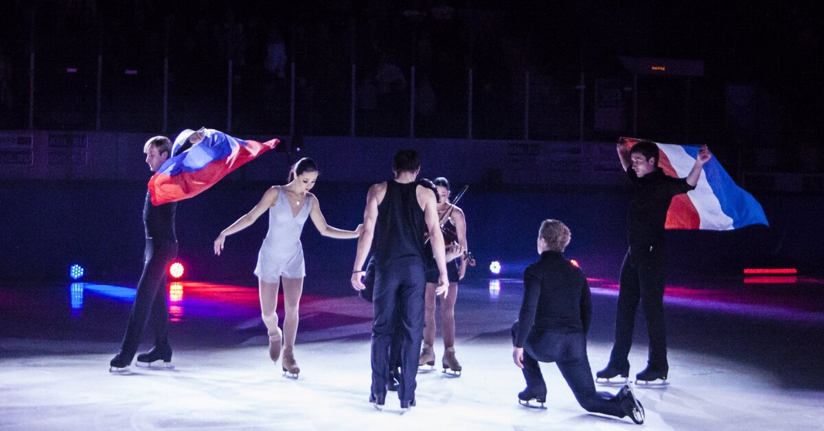 Сначала «второстепенные» фигуристы появились на сцене в черных одеждах, а чуть позже на лед вышли Евгений и Бриан с российским и французским флагами в руках.