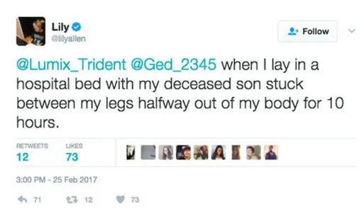 На такое высказывание Лили не смогла не ответить. Певица подтвердила, что действительно проходила лечение - из-за потери новорожденного ребенка в 2010 году. «Я лежала в больничной кровати, с умершим сыном, застрявшем между моих ног на полпути, в течение десяти часов», — ответила она.
