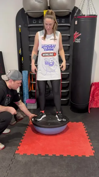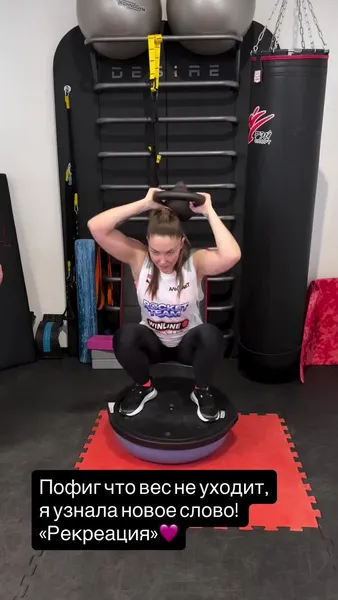 Муцениеце выполняла непростые упражнения с гирей, стараясь сохранить равновесие на балансире. «Пофиг, что вес не уходит! Я узнала новое слово "рекреация"», — прокомментировала Агата.