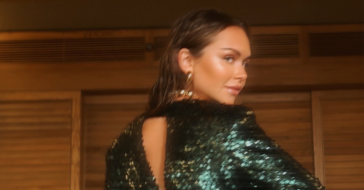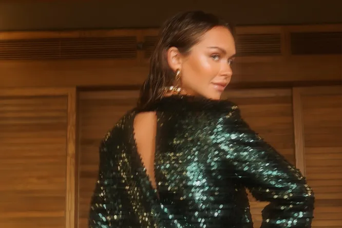 Дочь исполнителя хита «Ты одна, ты одна такая» примерила сияющее платье насыщенного изумрудного оттенка, расшитое пайетками, авторства своего бренда. Мини с деликатным вырезом на спине подчеркнуло стройную фигуру девушки.