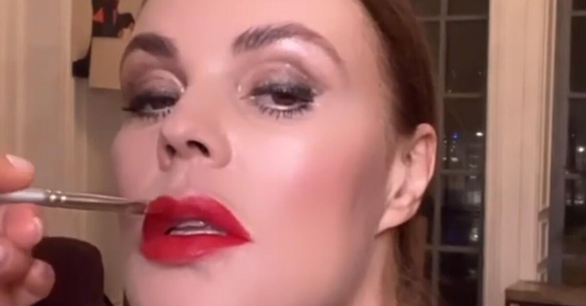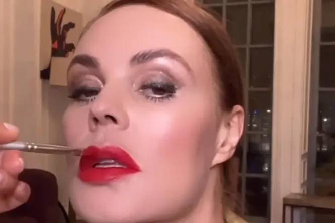 Теледиве наложили ровный тон и румяна, а также оформили «соколиные» брови. Последним штрихом в макияже стали губы. Визажист решила сделать их классически красными.