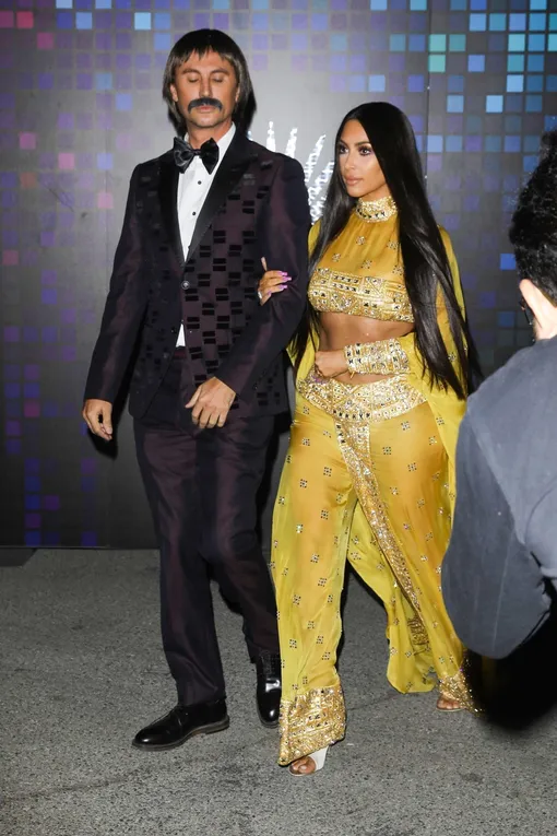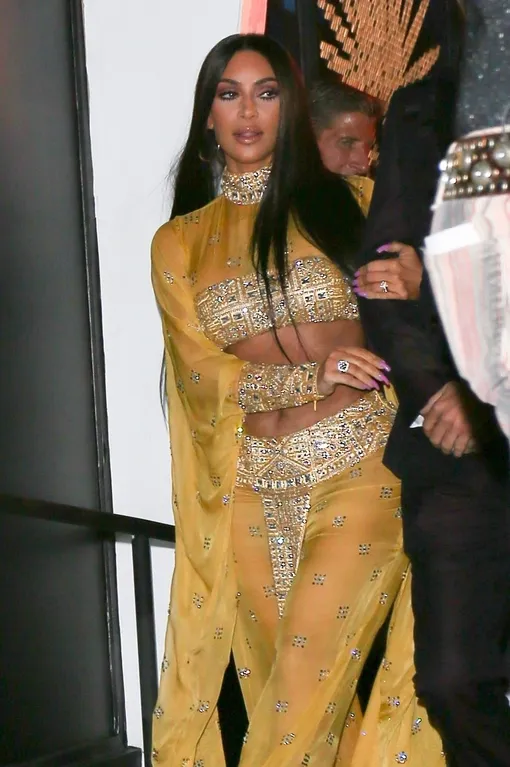 Теледива решила выбрать необычный образ. По крайней мере, поклонники звезды реалити-шоу явно не ожидали увидеть Ким такой. Кардашьян перевоплотилась в восточную царицу! Широкие брюки желтого цвета и расшитый золотом топ в сочетании с массивными украшениями и идеальными волосами помогли создать антуражный образ.