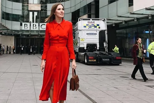 Для появления на шоу знаменитость выбрала приталенное ярко-красное платье Ulyana Sergeenko, классические бежевые туфли-лодочки и небольшую коричневую «любимую сумочку английской королевы» бренда Launer Bespoke.