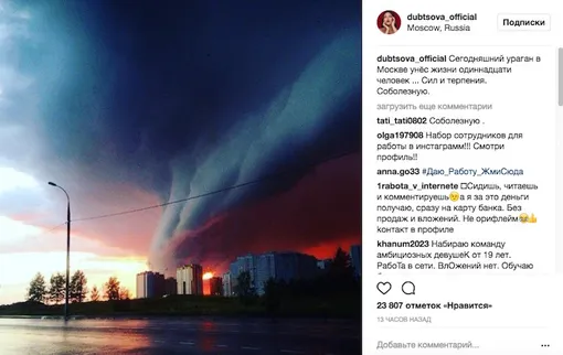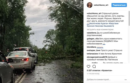 Знаменитости поделились последствиями страшного урагана в Москве, выложив фотографии и видео в Instagram (Социальная сеть признана экстремистской и запрещена на территории Российской Федерации). Кто-то поспешил сообщить, что обошлось без жертв, другие же выражали опасения по поводу образовавшихся в результате непогоды пробок.