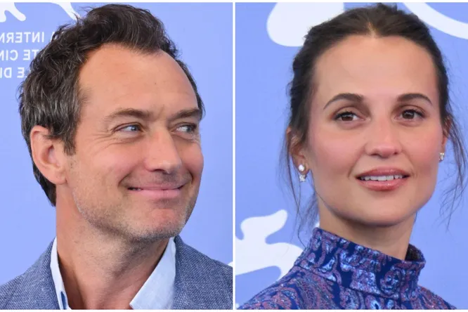 Джуд Лоу и Алисия Викандер в синих нарядах появились на премьере фильма о России в Венеции