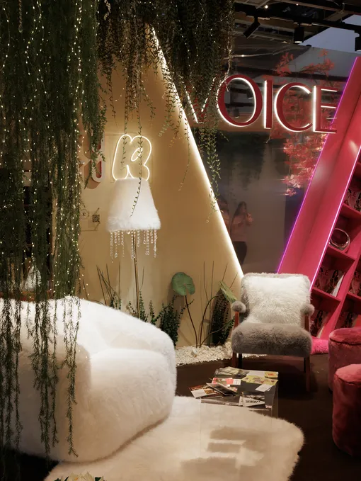 Стенд VOICE и FURFUR — место ярких идей и фотографий, в котором хочется задержаться, чтобы вдохновиться и отдохнуть душой. Пространство условно поделено на две части: слева — оазис уюта, справа — вспышка энергии и креатива. Созданные контрасты от дизайнера и основательницы бренда FURFUR Татьяны Безверхой, необычные цвета, смелые фактуры создают ощущение движения и футуризма, будто портал в мир фантазий. Каждый уголок пронизан уникальными деталями — от деликатных осветительных элементов до яркой пушистой текстуры мебели. Стенд украшен декоративной зеленью, словно он находится в волшебном лесу.