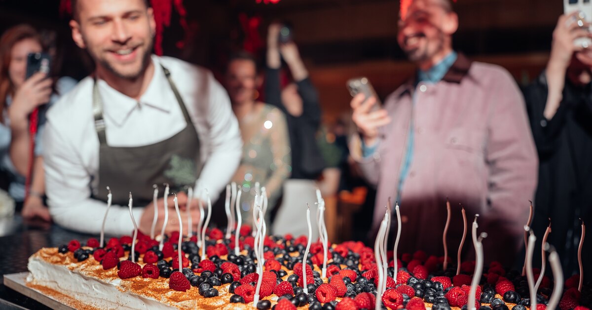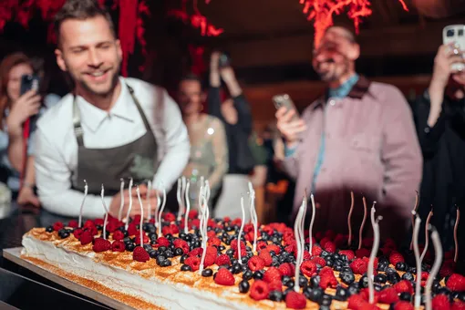 Вместо строгой очередности подач в течение ужина были щедрые блюда на компанию — как на семейных праздниках и теплых вечеринках для самых близких. День рождения начался с амюз-буш от Саши Пименова — фаршированные яйца с анчоусами, пампушки и мягкий сыр страккино. Далее гости попробовали салаты: со свеклой, запеченной на углях, от Игоря Арсенова и с пиканьей и соусом на основе перца рамиро от Дмитрия Голенина. Холодные закуски — мясной террин и карпаччо из скумбрии — приготовили Игорь Арсенов и Андрей Аникиев, горячие — сердце оленя и артишоки на гриле — Ахмед Охунов и Дмитрий Голенин. Основные блюда — филе онежского судака и фермерская утка — представили Андрей Аникиев и Ахмед Охунов. Завершили ужин десерты: яблочный сорбет с карамельным кремом от Дарьи Шмаровой и именинный медовик от команды кондитеров Sage.