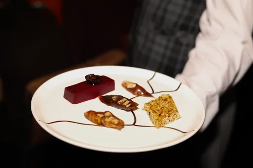 Меню ужина включало сациви из индейки с гоми, хачапури Бочулеби, жареного поросенка с зеленым ткемали, цыпленка по-чкмерски, чакапули из козленка, и сразу три классических грузинских десерта — пеламуши, гозинаки и чурчхелу. Особенно запомнился сорбет из граната с тархуном, который Шеф-Маруся приготовила прямо при гостях — яркий акцент, освежающий рецепторы между горячими блюдами.