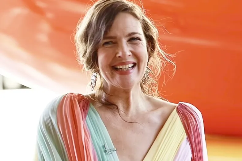 Дрю Бэрримор в шелковом разноцветном платье прокатилась на Виннермобиле в Нью-Йорке