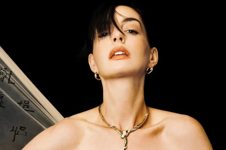 Энн Хэтэуэй в золотом платье-кольчуге с обнаженной спиной снялась для китайского глянца