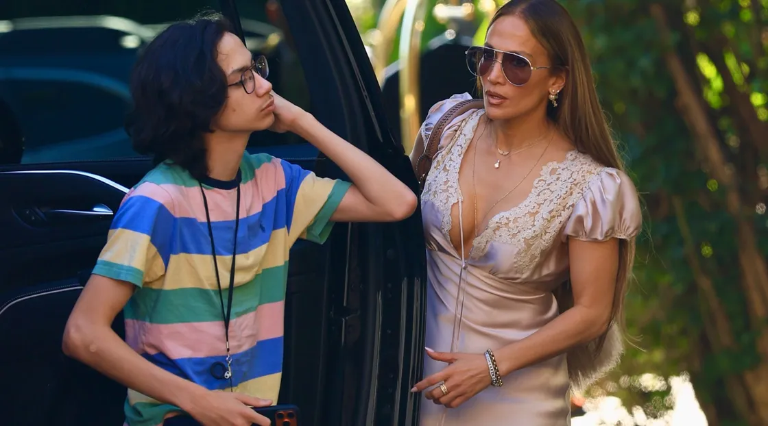 Дженнифер Лопес в платье с глубоким декольте без бюстгальтера вместе с 17-летним сыном поймали папарацци — 7 фото