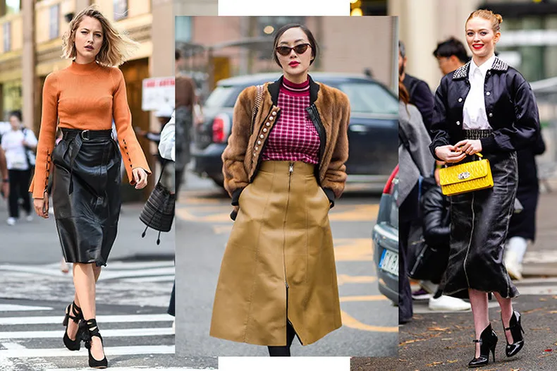 Кожаные юбки ниже колена: 8 примеров удачных образов