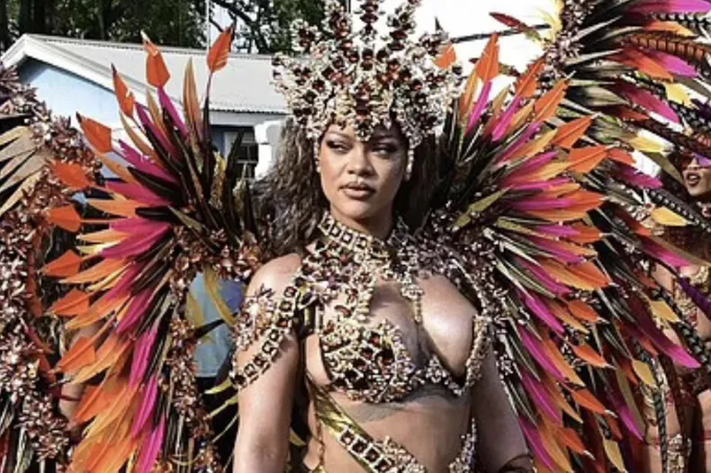 Рианна показала фигуру в сверкающем наряде из камней и перьев на барбадосском карнавале