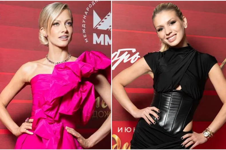 Полина Максимова в розовом платье с экстремальным разрезом и Люся Чеботина в черном мини появились на премьере комедии