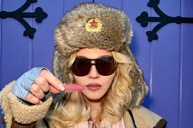 Певица Мадонна в шапке-ушанке с советской кокардой посетила выставку российских художниц