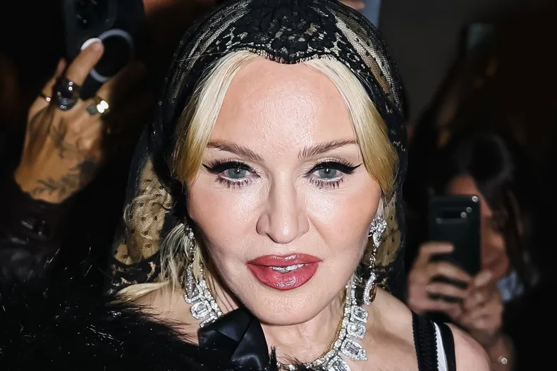 Мадонна в корсетном мини-платье и синих латексных перчатках появилась на модном шоу в Милане